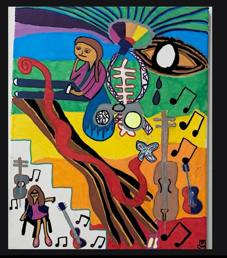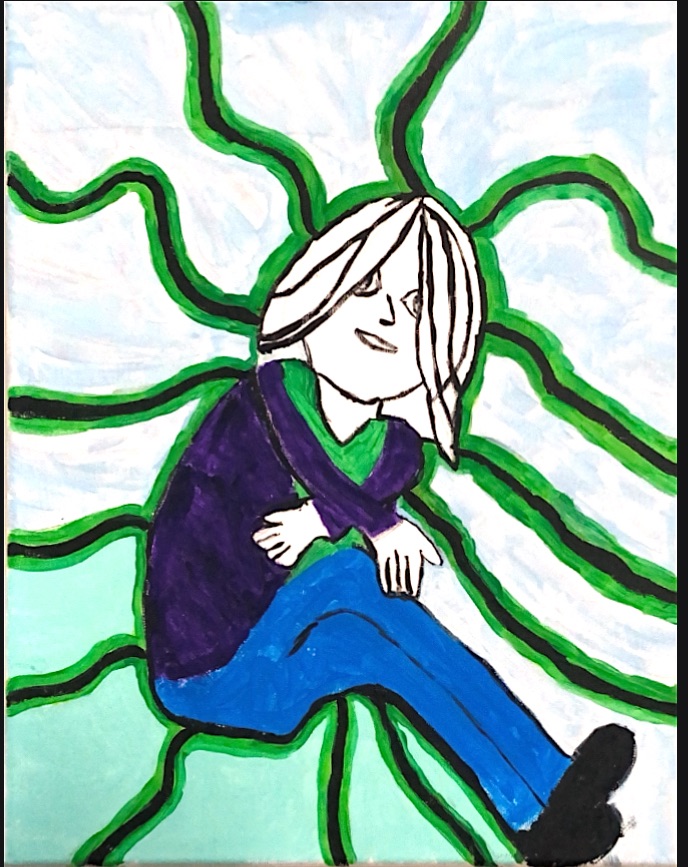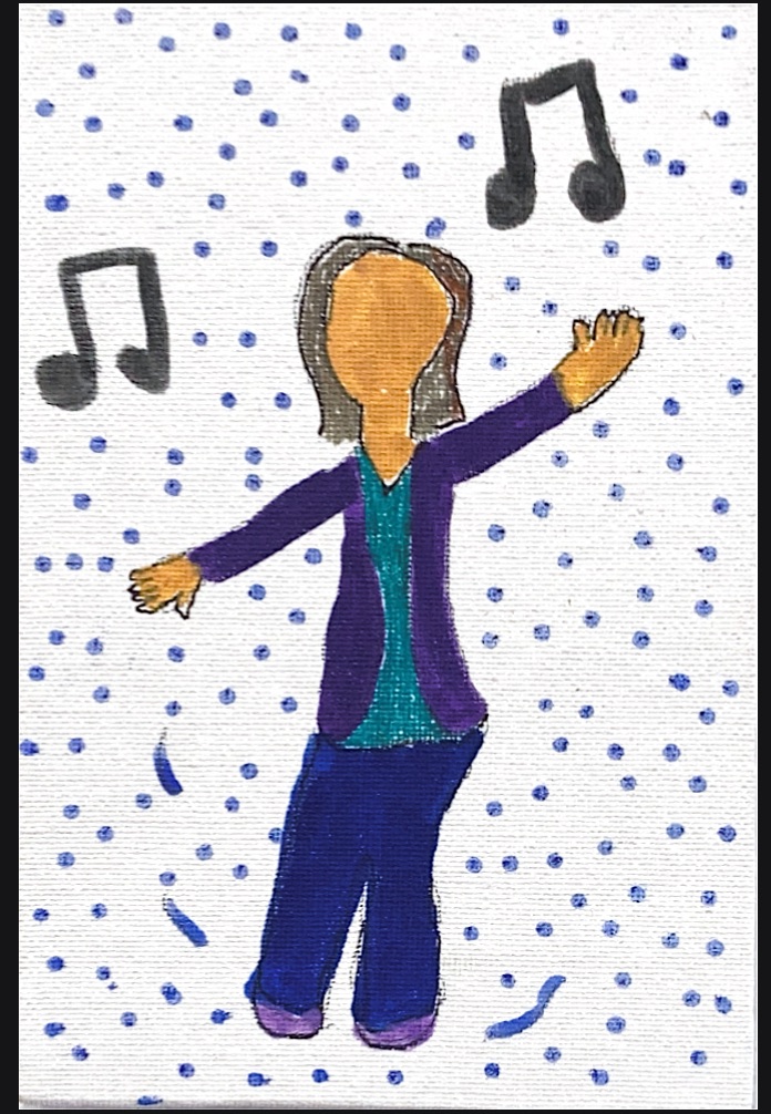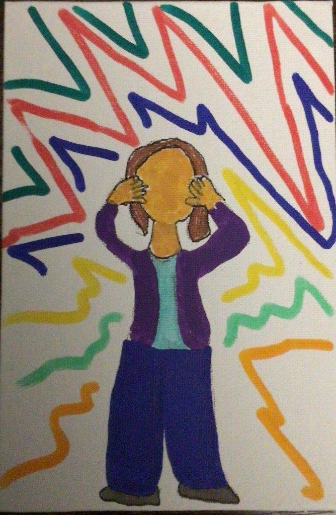 This is a 4×6 piece that has an Autistic woman who has found herself in a space that has too much light and sound and she uses her hands and her body as a form of communication to express how she feels in that moment.