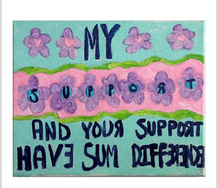Pink and blue and purple background with flowers. This piece is about how support looks different for everyone. It’s about accepting and including people where they are and learning about what a person needs to be in the space they are in.