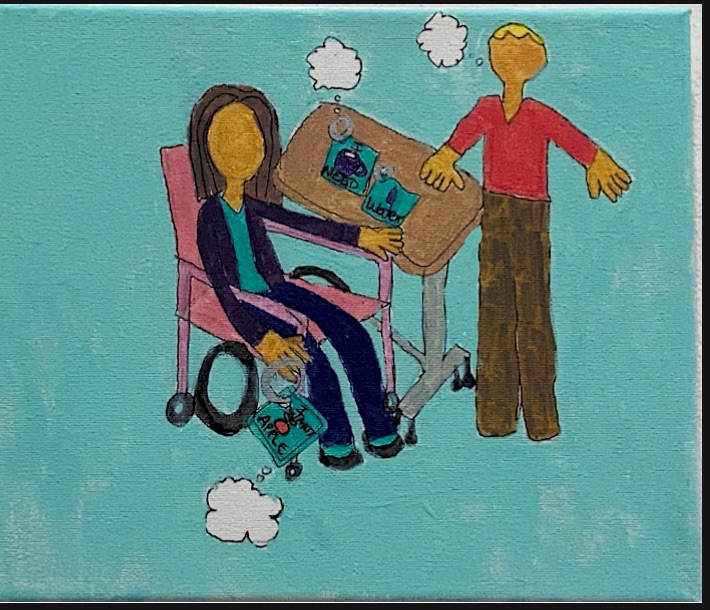 A painting about how communities can be more accessible to everyone by creating spaces that allow for everyone to communicate. This painting has a giant picture exchange communication board in the center of it. It features a woman in a wheelchair who is trying to navigate her community. It has a gray road and green grass and a community built around the giant picture exchange communication board.