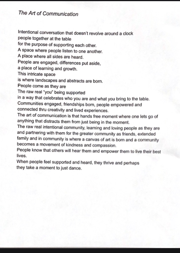 The raw real intentional community, learning and loving people as they are and partnering with them for the greater community as friends, extended family and in community is where a canvas of art is born and a community becomes a movement of kindness and compassion.